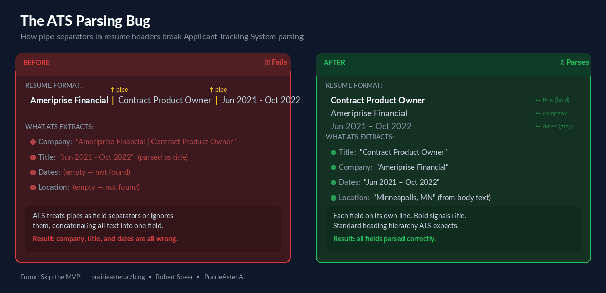 The most concrete feedback-to-fix cycle came from ATS testing. Users reported that the "fill from resume" feature in applicant tracking systems wasn't parsing employer names correctly. The root cause: company names and dates were combined on one line with a pipe separator — a format that looks clean to humans but that ATS parsers can't reliably tokenize.